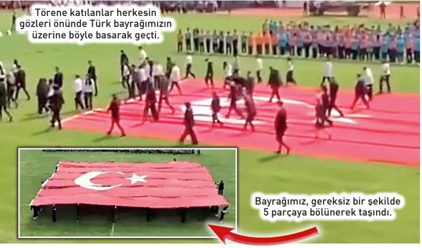 Bağımsızlığımızın sembolü olan bayrağımızın şeritler halinde parçalara bölünüp üzerinde yürünmesine büyük tepki gelmişti.