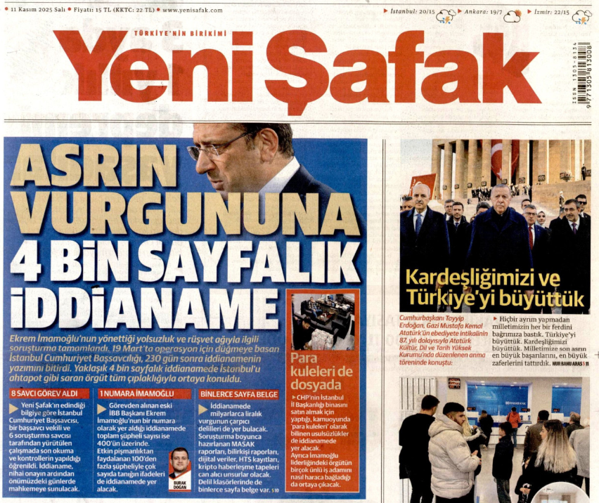 İstanbul Cumhuriyet Başsavcılığı tarafından İstanbul Büyükşehir Belediyesi (İBB) hakkında yürütülen ve henüz kamuoyuna açıklanmamış “yolsuzluk” soruşturmasına ilişkin iddianame, iktidara yakınlığıyla bilinen Yeni Şafak gazetesi tarafından yayımlandı.