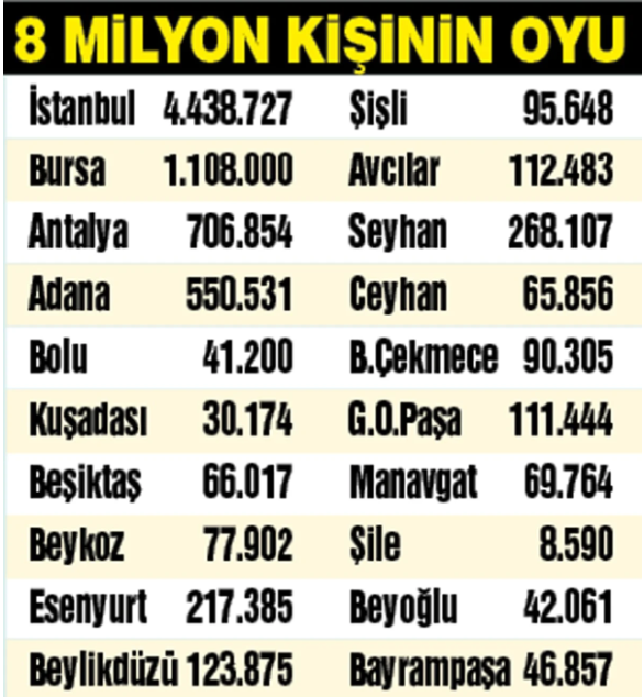 İstanbul’da ise elindeki 14 belediyeyi korudu ve Beyoğlu, Bayrampaşa, Beykoz, Çatalca, Silivri, Çekmeköy, Eyüpsultan, Sancaktepe, Tuzla, Şile ve Üsküdar’ı da kazanarak önemli bir başarı elde etti.