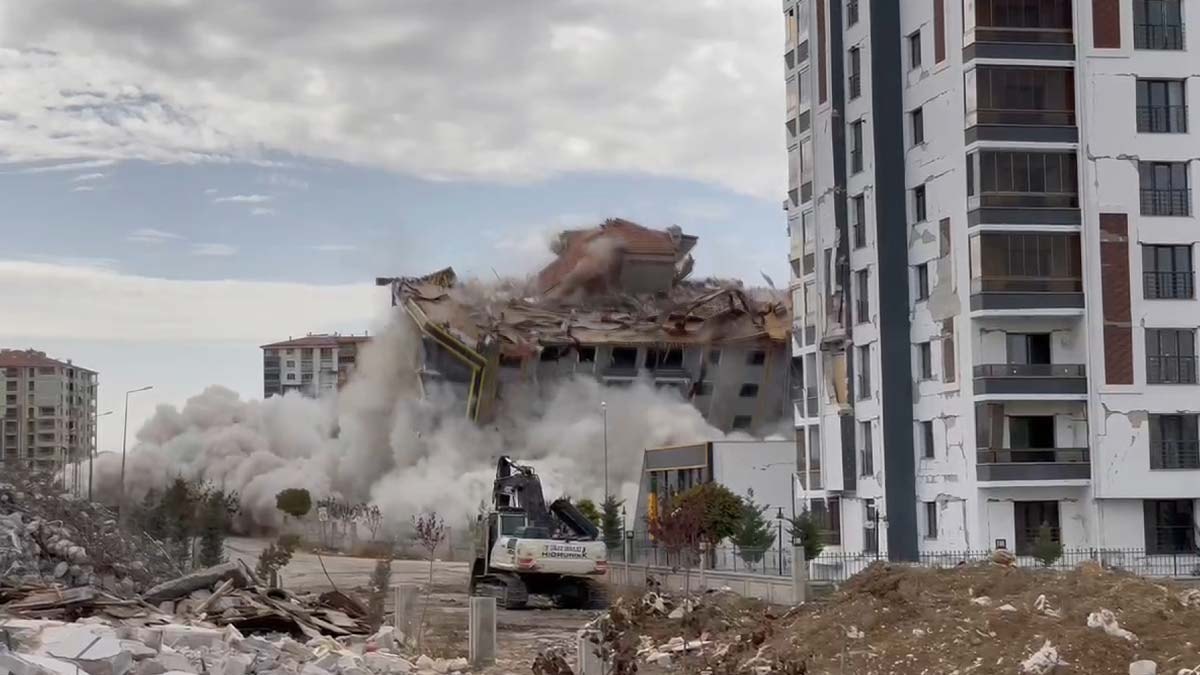 Malatya'da depremde ağır hasar gören binaların yıkımı sürüyor. Bostanbaşı Mahallesi'ndeki 12 katlı bir binanın yıkım işlemlerinin patlayıcı kullanılarak gerçekleştirilmesine karar verildi. Uzman ekibin yaptığı incelemenin ardından binanın taşıyıcı kolonlarına dinamit yerleştirdi.
