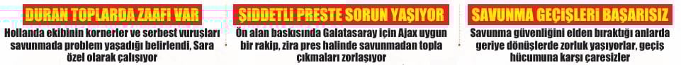 Teknik Direktör Okan Buruk, duran topların etkili ismi Gabriel Sara’yı özel olarak çalıştırdı. Rakibin eksik yönlerinden biri ise savunmayı yükseğe çektiği anda geri dönüşlerde zorlanması olarak belirlendi. Zaman zaman presin merkezini orta alana kadar çekecek Okan Buruk, böylece kapacağı toplar ile Ajax’ı eksik yakalamayı planlıyor. Önceki maçlarda birçok tehlike yaratan Okan Buruk, hızlı isimleri kullanarak benzer senaryoyu tekrarlamak istiyor.