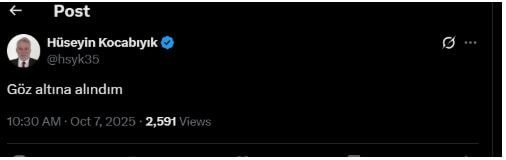 ANKA- AKP'ye ve Cumhurbaşkanı Recep Tayyip Erdoğan'a yönelik açıklamalarıyla gündeme gelen eski AKP İzmir Milletvekili Hüseyin Kocabıyık, sosyal medya hesabından yaptığı paylaşımla gözaltına alındığını duyurdu.
