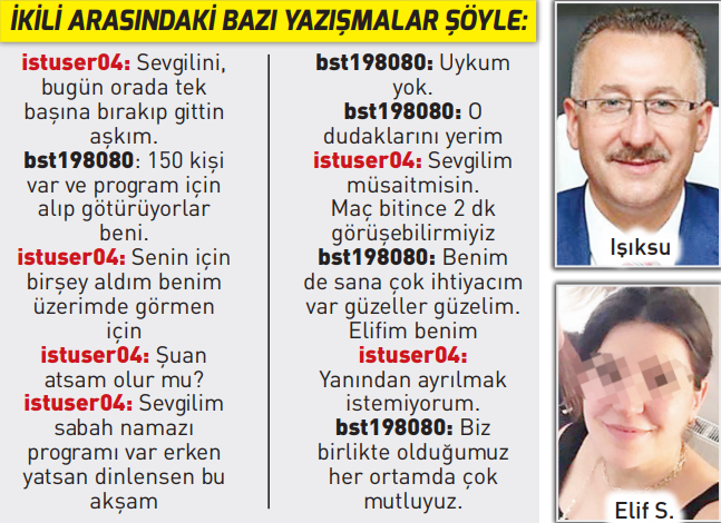 Aldatılan Hakan S.’nin boşanma dilekçesinde sunduğu yazışmalarda Elif S. ‘istuser04’ rumuzu, AKP’li Işıksu’nun da ‘bst198080’ rumuzunu kullandığı belirtildi.