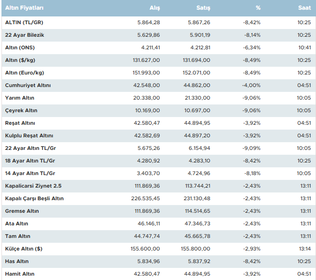 18 ayar altın gram fiyatı ise 4.280 liraya gerileyerek yaklaşık yüzde 8,42 düşüş yaşadı. 14 ayar altında da benzer şekilde sert gerileme görüldü.