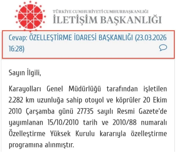 Yavuzyılmaz, 23 Mart 2026 tarihli CİMER yanıtına dayandırdığı açıklamasında, Karayolları Genel Müdürlüğü’nün işlettiği 2 bin 282 kilometrelik otoyol ve köprü ağının halihazırda özelleştirme paketi içinde yer aldığını belirtti. Çevre otoyollarının da bu paketin bir parçası olduğunu ifade eden Yavuzyılmaz, 2010 yılında özelleştirme kapsamına alınan bu yolların 2026 itibarıyla devredilmesi halinde yeni bir gelir modelinin olacağını ifade etti.