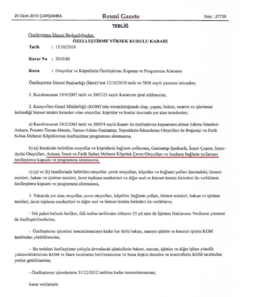Yavuzyılmaz’ın açıklamasına göre özelleştirme kapsamına alınması planlanan yollar Ankara Çevre Otoyolu, İstanbul 2. Çevre Otoyolu, İzmir Çevre Otoyolu, Bursa Çevre Otoyolu ve Gaziantep Çevre Otoyolu oldu.