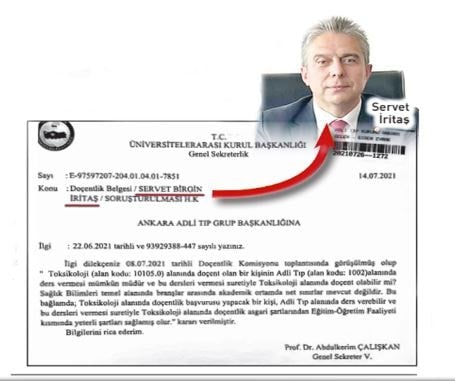 Uzmanlık belgesi olmadan Adli Tıp dersleri veren doçentin Toksikoloji (Zehir Bilimi) alanında doktora sahibi olduğu, Tıpta Uzmanlık Sınavı (TUS) ile kazanılması zorunlu olan Adli Tıp Uzmanına unvanına sahip olmadığı anlaşıldı.