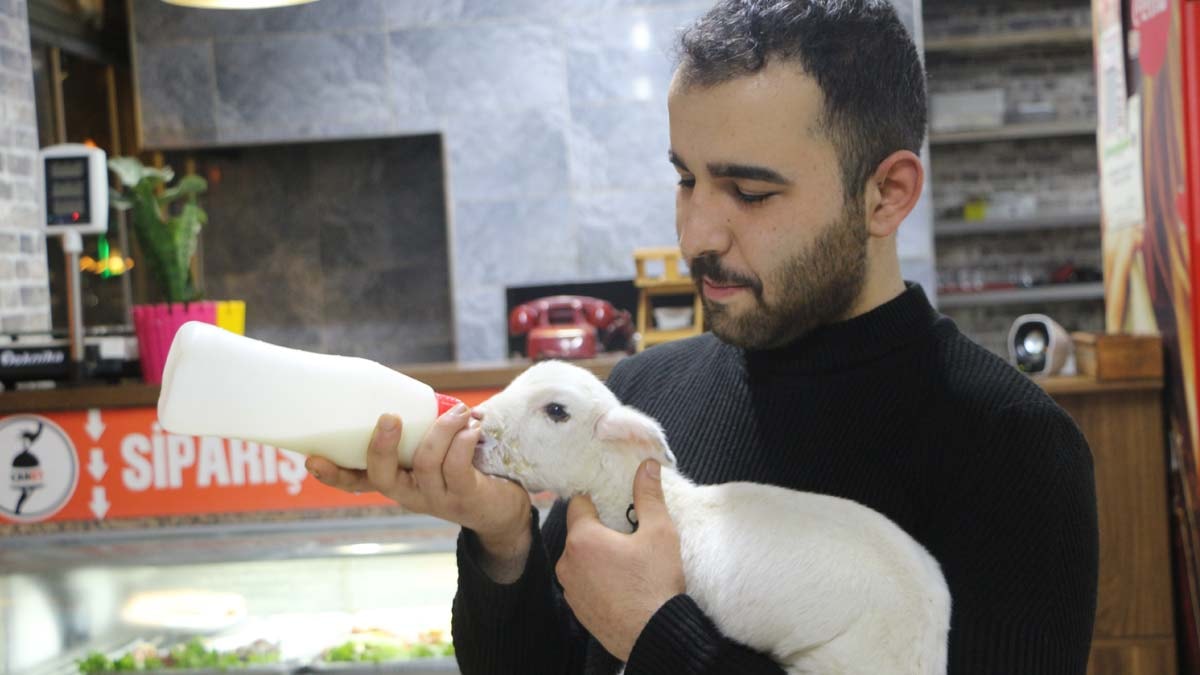 'Nohut' adı verdiği kuzuyu biberonla besleyen Akif Temir, "Yemekte kullandığımız etlerimizi kendimiz sağlamak amacıyla çiftlik kurduk. Koyun yetiştiriciliği yapıyoruz. Bundan bir hafta önce koyunumuz doğum yaptı. İkiz kuzumuz oldu. Daha sonra koyunumuz ve ikizlerden biri öldü. Çiftlikteki diğer koyunlar buna bakmadı. Biz de kendimiz bakmaya karar verdik. Gündüzleri iş yerimize getiriyoruz. Akşamları ise evimize götürüyoruz. Kendimiz biberonla emzirmeye çalışıyoruz. Müşterilerimiz genellikle memnun. Müşterilerimiz fotoğraf çekiniyorlar. İsmini ise Nohut koyduk. Yaşaması için çabalıyoruz" dedi. (DHA)