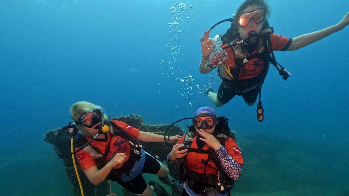 Side Limanı'ndan tekneyle açılan kadınlara, proje yürütücüsü Gaye Dülger tarafından yapacakları ayrıntılı şekilde anlatıldı. Adayların su altında nasıl davranmaları gerektiğini söyleyen Dülger, eğitimcilerin çok profesyonel olduğunu belirterek, talimatlara mutlaka uyulması gerektiğini vurguladı. Bilgilendirmenin ardından 8'li, 10'lu gruplar halinde eğitmenler tarafından dalış malzemeleri takılan kadınlar ilk kez su altına dalış yaptı. Dalış sırasında Side Su Altı Müzesi'ni de ziyaret eden adaylar heyecanlı anlar yaşadı.