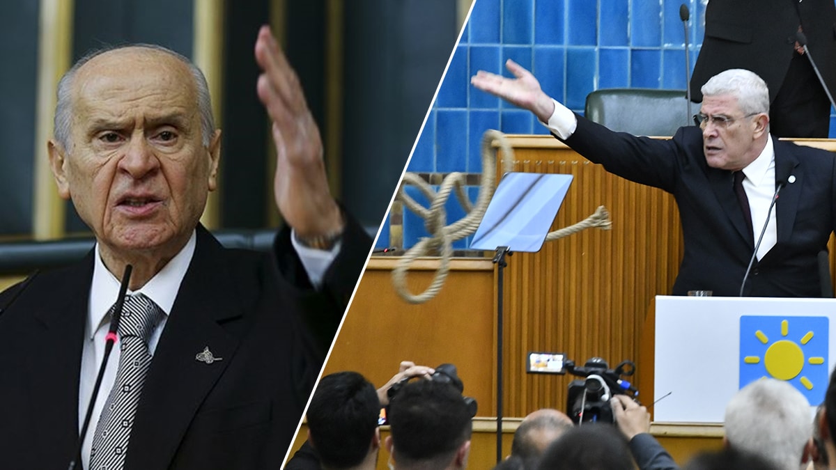 İYİ Parti Genel Başkanı Dervişoğlu, partisinin TBMM grup toplantısında, MHP Genel Başkanı Devlet Bahçeli'nin 2007'de Erzurum'da düzenlediği mitingde ip atmasına gönderme yaparak, "Erzurum Meydanı'nda Sayın Devlet Bahçeli, Tayyip Erdoğan'a ip atarak, 'Ben asamadım, asabiliyorsan sen as' demişti. Buradan Devlet Bahçeli'ye sesleniyorum; Abdullah Öcalan'ı asamadınız; ama bu büyük milletin hayallerini astınız. Al şimdi bu ipi baş köşede, başının ucuna as" diyerek elindeki ipi kürsüden fırlattı.