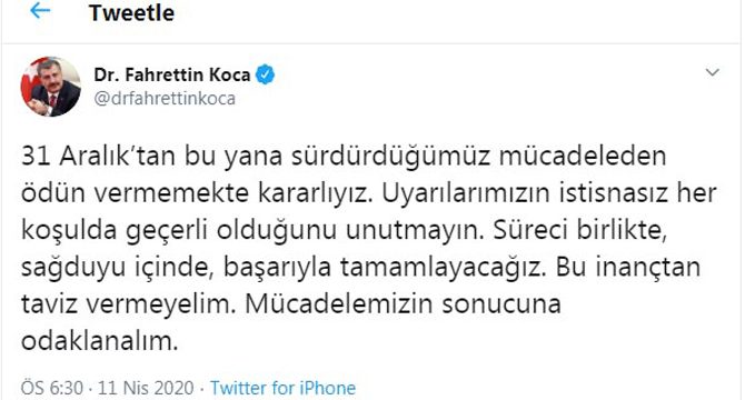 Bakan Koca, Twitter hesabından açıklama yaptı. Bakan Koca, "31 Aralık’tan bu yana sürdürdüğümüz mücadeleden ödün vermemekte kararlıyız. Uyarılarımızın istisnasız her koşulda geçerli olduğunu unutmayın. Süreci birlikte, sağduyu içinde, başarıyla tamamlayacağız. Bu inançtan taviz vermeyelim. Mücadelemizin sonucuna odaklanalım" ifadelerini kullandı.