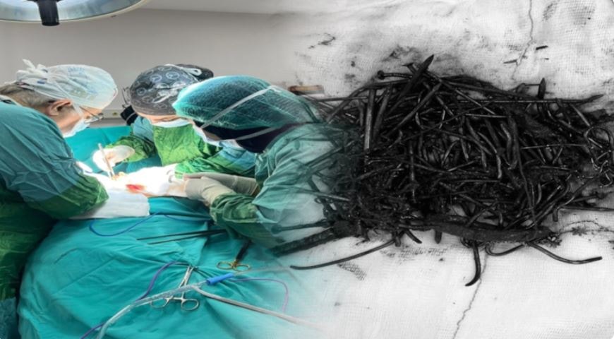 Genel cerrahi uzmanı Dr. Can Terzier ve ekibi tarafından acil olarak ameliyata alınan A.K.'nin midesinden yaklaşık 1 kilo ağırlığında çivi, inşaat demiri, kolye, toka gibi çeşitli metal cisimler çıkarıldı.