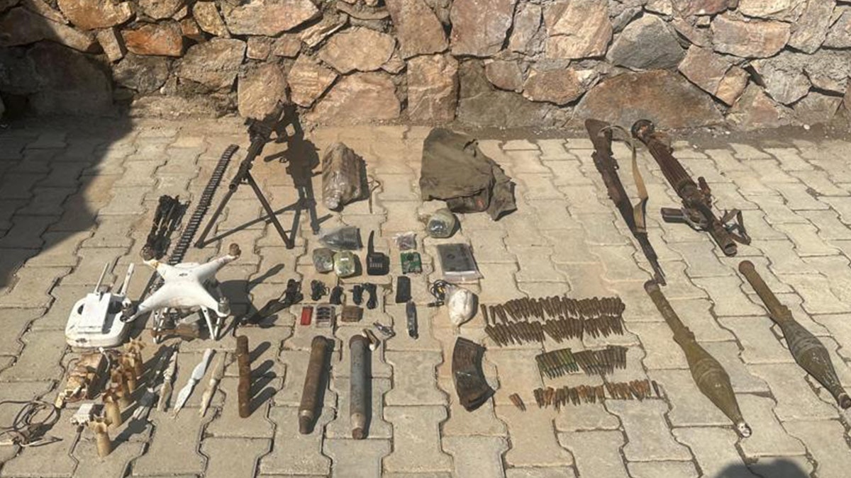 Bölgede yapılan aramada, RPG-7 roketatar silahı, 2 anti-tank mühimmatı, 2 anti-personel mühimmatı, 4 roket sevk fişeği, PKM makineli tüfek ve 30 mühimmatı, mavzer tüfek ve 16 mühimmatı, 2 kalaşnikof şarjörü, 30 kalaşnikof mühimmatı, dron, 4 dron dengeleyici aparat, drona monte edilen 5 havan tapası, yarım kilogram plastik patlayıcı, el yapımı patlayıcıda kullanılmak üzere hazırlanmış 6 uzaktan komutalı anahtar sistemi, Glock marka tabancaya ait şarjör, havya, 10 metre lehim teli, 5 şarj kablosu, 3 akü, gıda, mutfak ve yaşam malzemeleri bulundu.