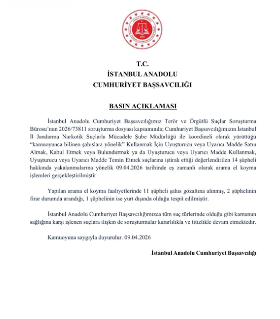 "İstanbul Anadolu Cumhuriyet Başsavcılığımız Terör ve Örgütlü Suçlar Soruşturma Bürosu’nun 2026/73811 soruşturma dosyası kapsamında; Cumhuriyet Başsavcılığımızın İstanbul İl Jandarma Narkotik Suçlarla Mücadele Şube Müdürlüğü ile koordineli olarak yürüttüğü “kamuoyunca bilinen şahıslara yönelik” Kullanmak İçin Uyuşturucu veya Uyarıcı Madde Satın Almak, Kabul Etmek veya Bulundurmak ya da Uyuşturucu veya Uyarıcı Madde Kullanmak, Uyuşturucu veya Uyarıcı Madde Temin Etmek suçlarına iştirak ettiği değerlendirilen 14 şüpheli hakkında yakalanmalarına yönelik 09.04.2026 tarihinde eş zamanlı olarak arama el koyma işlemleri gerçekleştirilmiştir.