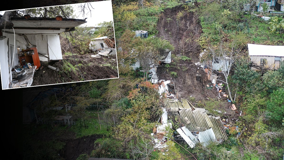 Heyelan sonucu evin bir bölümünün kaymasıyla oluşan boşluk, AA ekibince dronla görüntülendi.