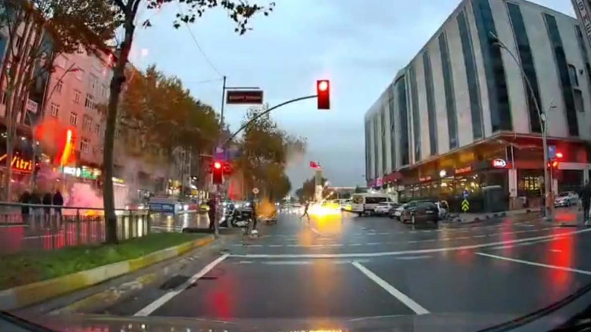 Görüntülerde, caddede havai fişeklerin patlatılması, çevredeki vatandaşların ve caddeden geçen motosiklet sürücüsünün panikle kaçtığı görülüyor. (DHA)