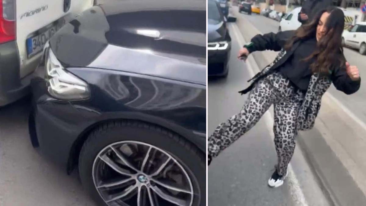 Özlem Ç. aracına geçen Baran Gür'ün üzerine yürüdü. "Kadınsın diye bir şey yapmıyorum" şeklinde tepki gösteren Baran Gür'e Özlem Ç., "Yap, adamsan yap diyerek" çarptığı aracı tekmeledi.
