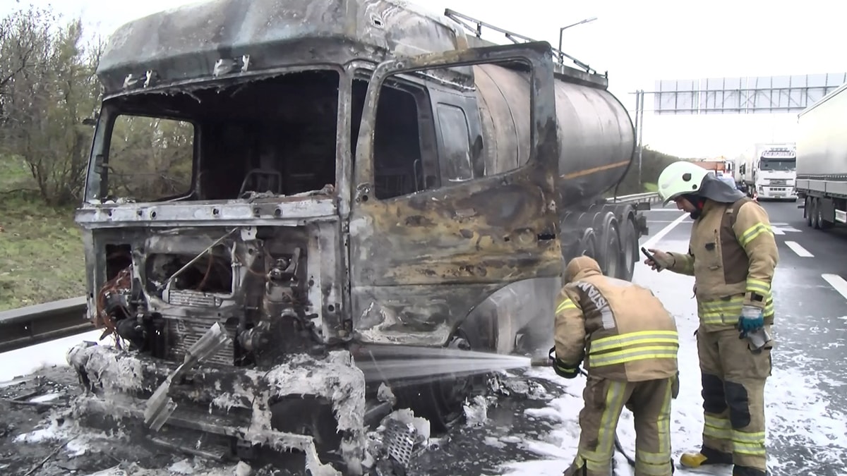 Yangın, saat 11.00 sıralarında TEM Otoyolu İstanbul istikameti Çatalca mevkiinde meydana geldi. Adem Yılmaz'ın idaresinde olan 41 F 9458 plakalı tutkal yüklü tankerin seyir halindeyken lastiği patladı.