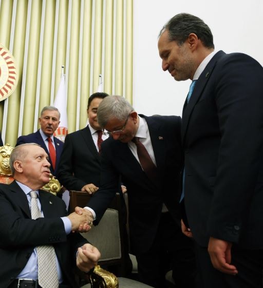 AKP, kurulduğu günden bu yana Gelecek ve DEVA ile bayramlaşmıyordu. Erdoğan, dün akşam yine ilk kez İYİ Parti lideri Dervişoğlu ile de bir araya geldi. Cumhurbaşkanı Erdoğan ile yıllar sonra bir araya gelen Davutoğlu’nun mutluluğu yüzüne yansıdı.