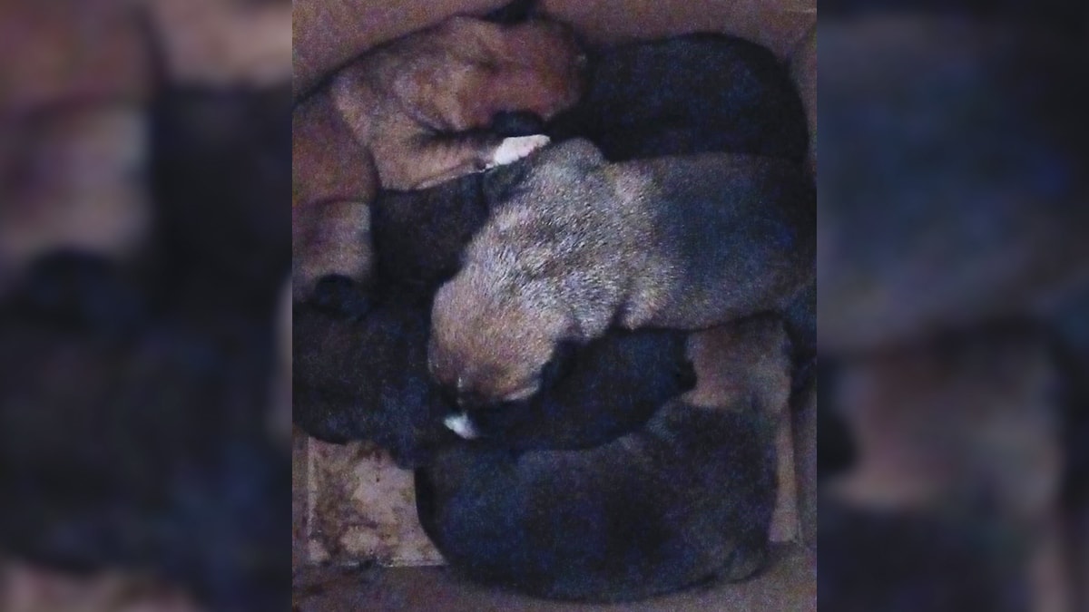 Konteyneri kontrol eden temizlik işçileri bir koli içerisinde 5 köpek yavrusu buldu.