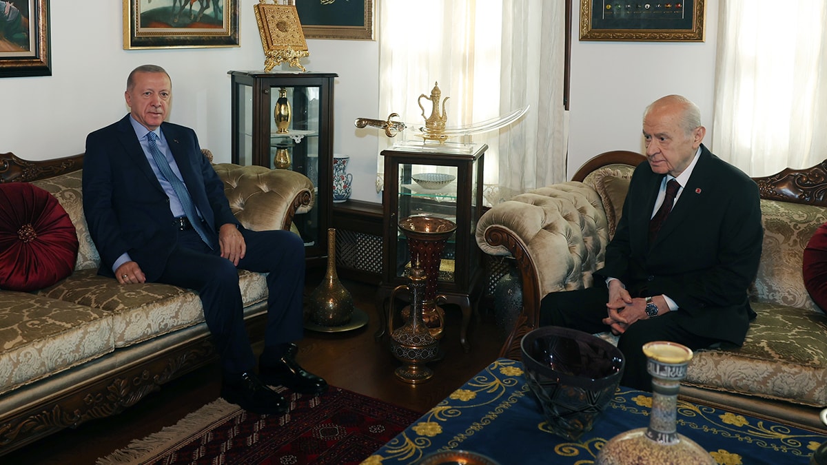 Cumhurbaşkanı Erdoğan, MHP lideri Bahçeli'yi evinde ziyaret etti. Bahçeli, Cumhurbaşkanı Erdoğan'ı bahçe kapısında karşıladı. Bahçeli'nin, Erdoğan'ın aracını beklerken tespih çektiği görüldü. Karşılamanın ardından Erdoğan ve Bahçeli, ikili görüşmeye geçti. Saat 14.00'te başlayan görüşme, basına kapalı sürüyor.