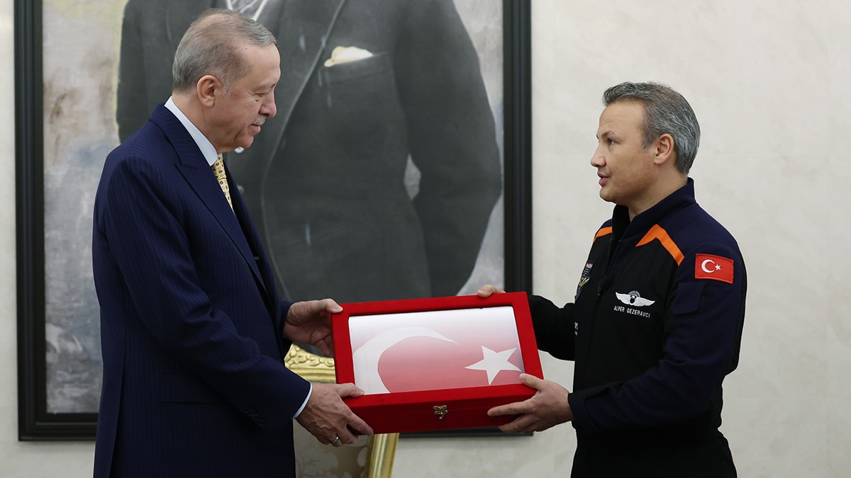 Cumhurbaşkanı Erdoğan, Türk bayrağını öpüp alnına koyarak teslim aldı. Kabulde, Cumhurbaşkanı Erdoğan'ın eşi Emine Erdoğan, Sanayi ve Teknoloji Bakanı Mehmet Fatih Kacır ile TÜBİTAK Başkanı Hasan Mandal da yer aldı.