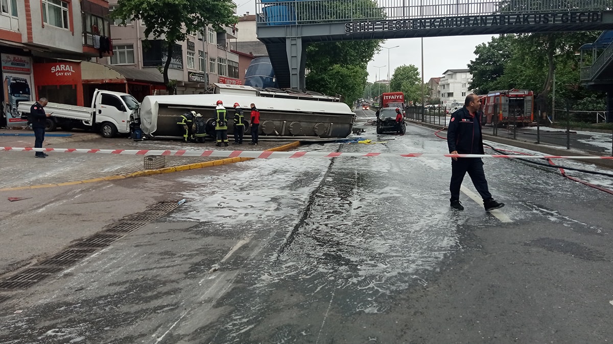Tankerin olay yerinden kaldırılması için çalışma başlatılırken, itfaiye ekipleri de tedbir amaçlı soğutma çalışması yürütüyor.