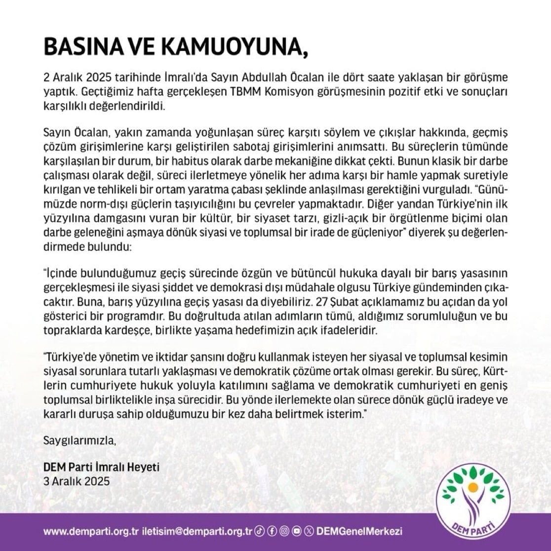 "2 Aralık 2025 tarihinde İmralı’da Abdullah Öcalan ile dört saate yaklaşan bir görüşme yaptık. Geçtiğimiz hafta gerçekleşen TBMM Komisyon görüşmesinin pozitif etki ve sonuçları karşılıklı değerlendirildi.