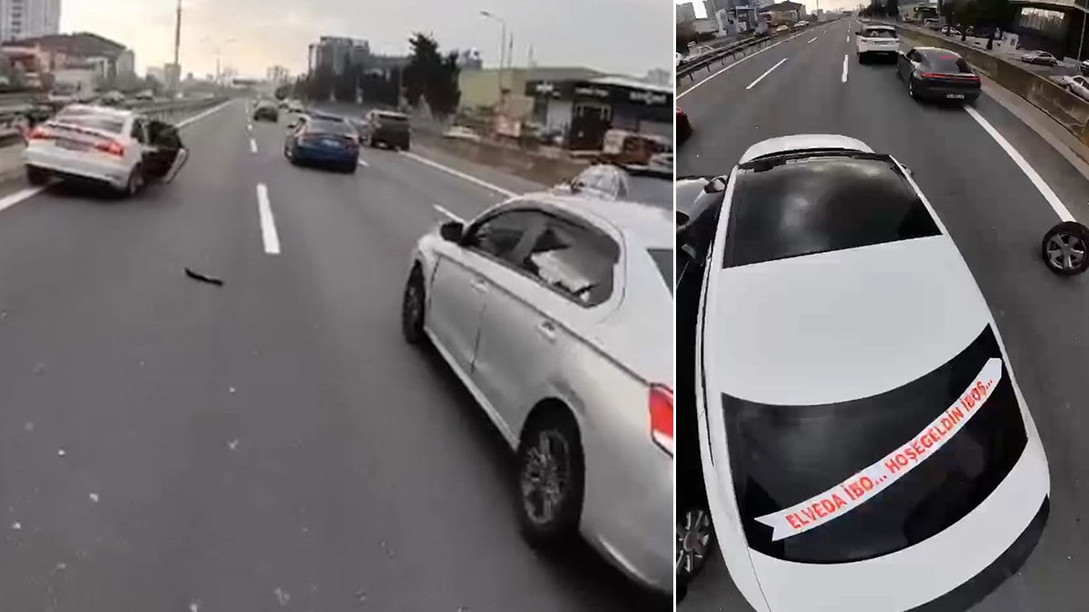 Olay, dün öğle saatlerinde, Basın Ekspres Yolu'nda meydana geldi. Düğün konvoyundaki araçlar otoyolda ilerlediği sırada emniyet şeridinden hızla gelen otomobil, sol şeride geçmek istedi. Konvoyda ilerleyen 34 ND 8381 plakalı otomobil sürücüsü direksiyonu çevirdiği sırada lastiği yerinden çıktı.Sürücüsünün kontrolünden çıkan araç, bariyerlere çarparak durabildi. Kazada ölen ya da yaralananın olmadı. Kaza anı, düğün konvoyunu görüntüleyen kameraya saniye saniye yansıdı.