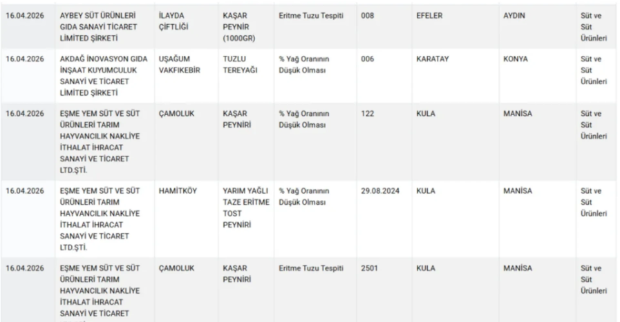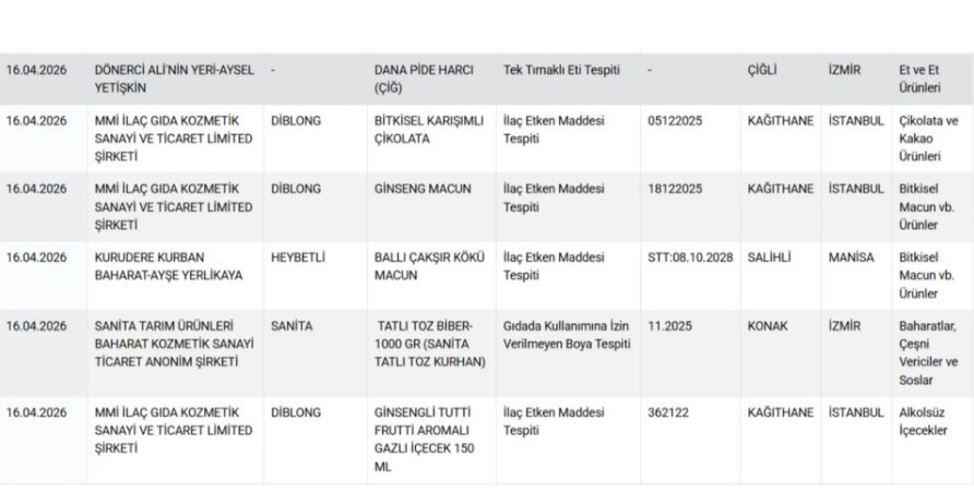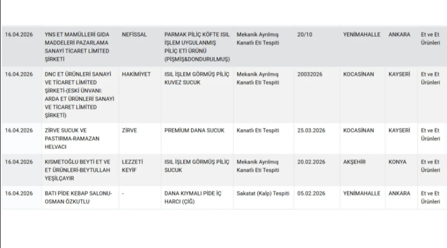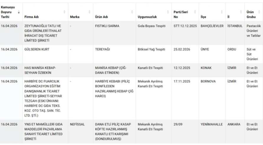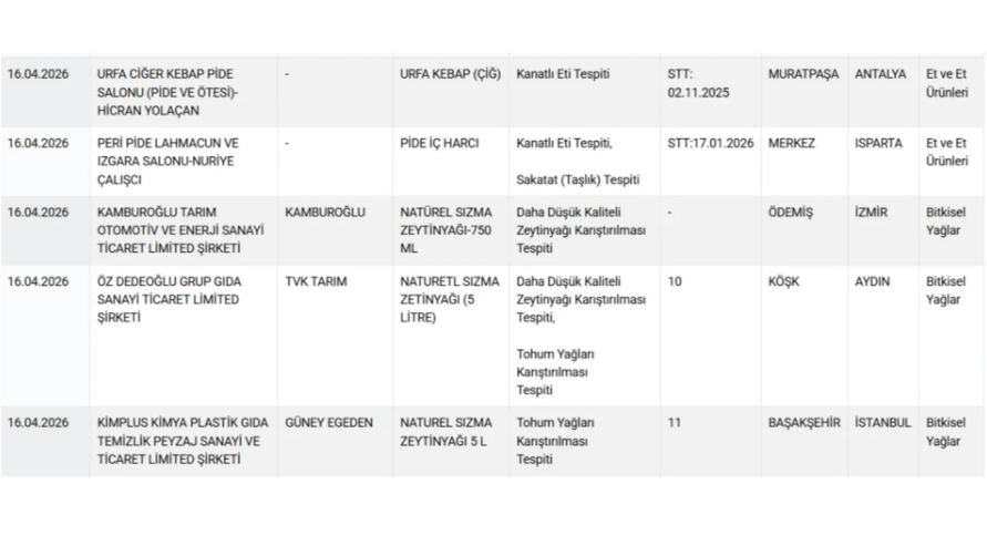 Bakanlık gıdada hile yapan firmaları ve ürünlerin yer aldığı listeyi güncelledi. 16 Nisan tarihli hileli listede bal, zeytinyağı, pide, kaşar, baharat, tatlı, tereyağı, kebap, köfte ve sucuk gibi ürünler yer aldı.