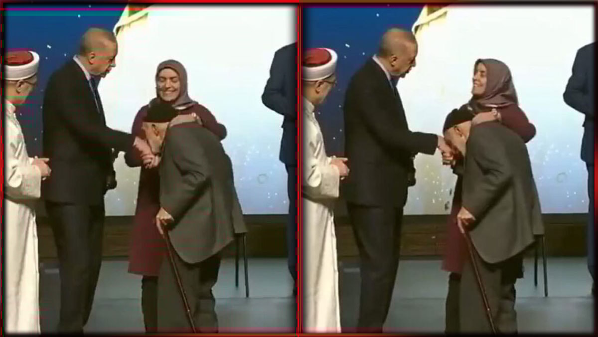 Cumhurbaşkanı Erdoğan'ın tören sırasında 92 yaşındaki bir kişiye el öptürdüğü görüntüler ortaya çıktı. Yanındaki bir kadınla sahneye bastonuyla gelen 92 yaşındaki bir adam, Erdoğan'ın elini öpmek istedi. Erdoğan ise kendisinden 21 yaş büyük bir kişiye elini öptürdü. Bu esnada tüm salon ise alkışlamaya başladı.