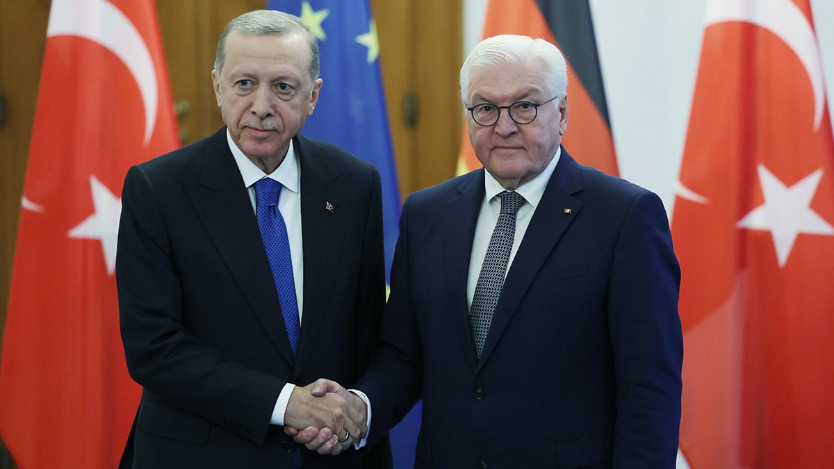 Cumhurbaşkanı Erdoğan ve Steinmeier, tokalaşarak basın mensuplarına poz verdi.