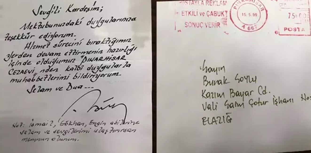 Erdoğan, Pınarhisar Cezaevi'nde Burak Soylu'ya yolladığı mektupta, şu satırları yazmıştı:-Sevgili kardeşim mektubunuzdaki duygularınıza teşekkür ediyorum.-Hizmet sürecini bıraktığımız yerden devam ettirmenin hazırlığı içinde olduğumuz Pınarhisar Cezaevi'nden kalbi duygularla muhabbetlerimi bildiriyorum selam ve dua ile…