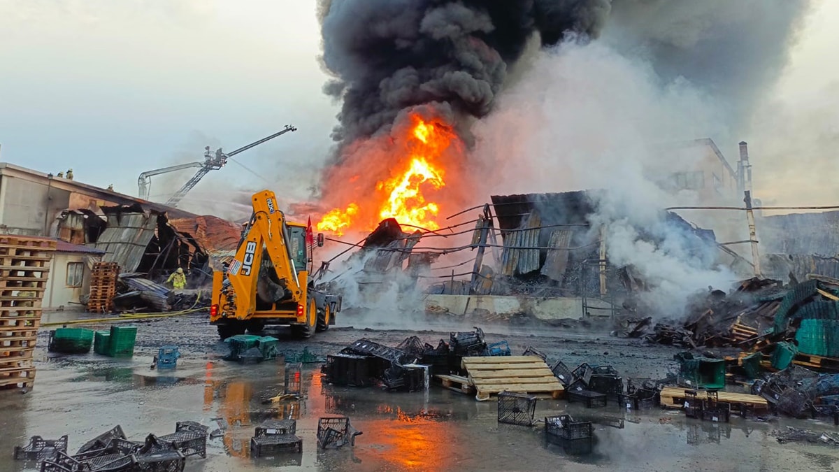 Ekiplerin, çevre iş yerlerine sıçrama riski bulunan yangını söndürme çalışmaları sürüyor.