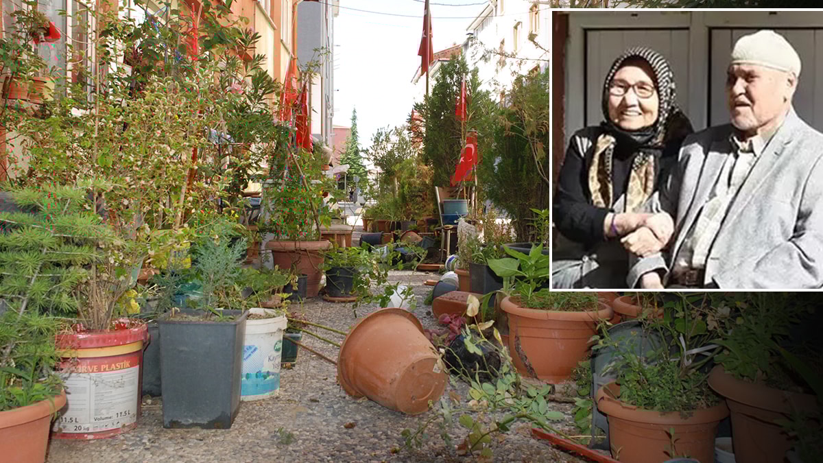 Tepebaşı ilçesi Mamure Mahallesi Uluvatan Sokağı'nda ikamet eden 82 yaşındaki Memduh Çetin, 17 yıldır felçli olan eşi Mücella Çetin için evinin önündeki kaldırımı çiçek ve ağaçlarla donattı. Eşinin durumunda iyileşme olduğunu gören Çetin, bu alanı genişletip Türk bayraklarıyla donattı.
