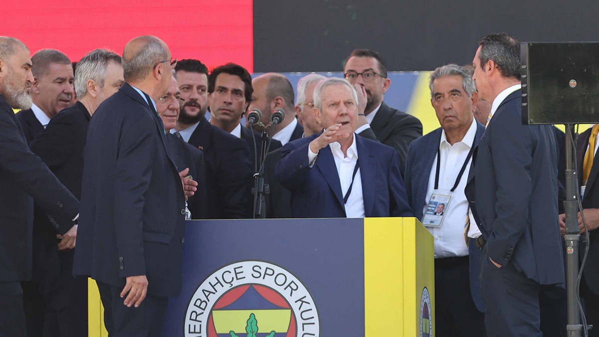 Fenerbahçe Olağan Seçimli Genel Kurulu, Ülker Stadyumu’nda devam ediyor. Fenerbahçe Başkan Vekili Erol Bilecik, 01.01.2023-31.05.2023 mali dönem ve 01.06.2023-29.02.2024 mali dönemine ilişkin Denetim Kurulu Raporu’nu okuduğu esnada başkan adayı Aziz Yıldırım ve yönetim kurulu listesinde yer alan isimler tribünden sahaya inerek konuşmanın gerçekleştirildiği alana yürüdü. Başkan Ali Koç ve yönetiminde yer alan isimlerle tokalaşan Yıldırım, ardından konuşmanın yaptığı kürsüye geldi. Genel Kurul Divan Başkanlığına seçilen Vefa Küçük, Aziz Yıldırım’a “Benden söz almanız gerekmektedir” deyince, Yıldırım, “Ben alırım. Sen orada seçilmeden oturdun” şeklinde cevap verdi. Konuşmaların sürmesinin ardından Küçük, “Kürsü işgal edilmiştir, kürsüyü boşaltacağız. Aziz Başkan kürsüye kadar geldiğine göre kendisine 30 saniye konuşma hakkı tanıyalım, zaten başkan adayı olarak konuşacak” dedi.