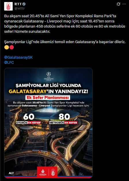İstanbul Elektrik Tramvay ve Tünel İşletmeleri (İETT), bu akşam oynanacak Galatasaray - Liverpool FC maçı öncesinde taraftar yoğunluğu nedeniyle ek ulaşım tedbirleri alacağını duyurdu.