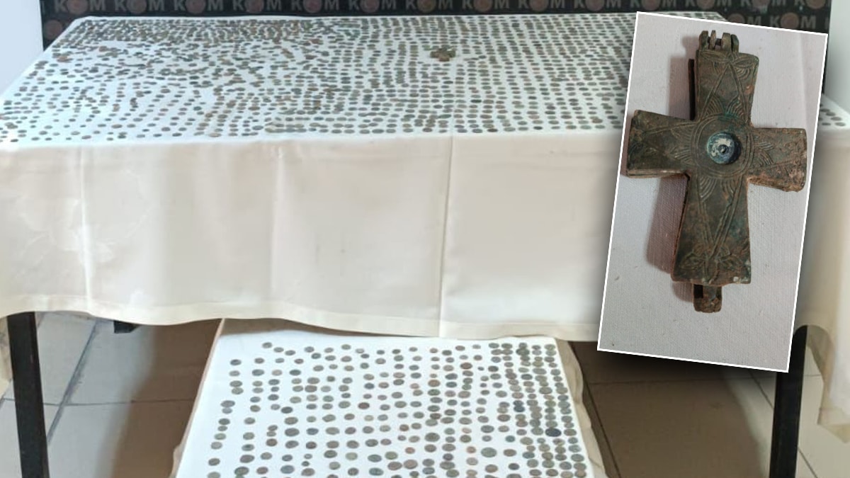 Adreste yapılan aramada çeşitli tarihi dönemlere ait olduğu değerlendirilen 2 bin 410 sikke ve haç figürü ele geçirildi.
