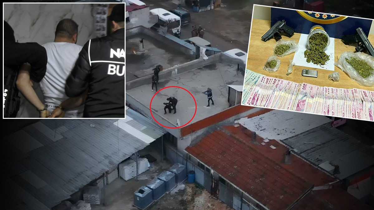 İl Emniyet Müdürlüğü Narkotik Suçlarla Mücadele Şube Müdürlüğü ekipleri, 100 ara yakalamada 133 kişiye ‘uyuşturucu madde kullanmak’ suçundan işlem yaptı. Şüphelilerin uyuşturucu maddeyi temin ettikleri kişileri belirleyen ekipler, uyuşturucu satıcılarına yönelik çalışma başlattı. Teknik ve fiziki takibin ardından, 6 Mart sabahı harekete geçen ekipler, Bursa Cumhuriyet Başsavcılığı koordinesinde önceden belirlenen çok sayıda adrese 2 İHA ve dron destekli şafak vakti operasyon düzenledi. Operasyona, Özel Harekat ve Çevik Kuvvet polislerinin de aralarında olduğu bin polis katıldı, 8 narkotik köpeği kullanıldı.