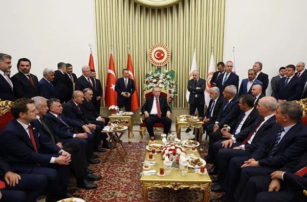 İlki... Cumhurbaşkanı Erdoğan’ın baş köşede oturduğu ve karşısında MHP, DEM ve İYİ Parti liderlerinin olduğu kare.