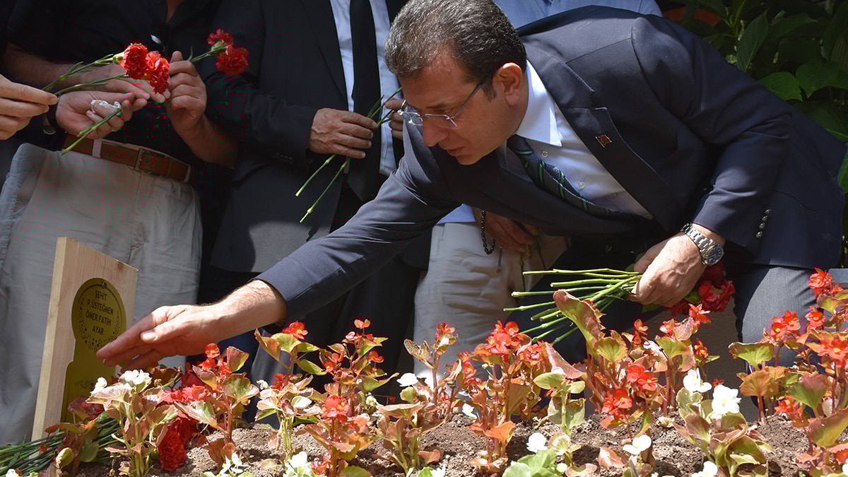 Kur'an-ı Kerim okunması ve dualar edilmesinin ardından İmamoğlu, şehidin mezarına çiçek bıraktı.