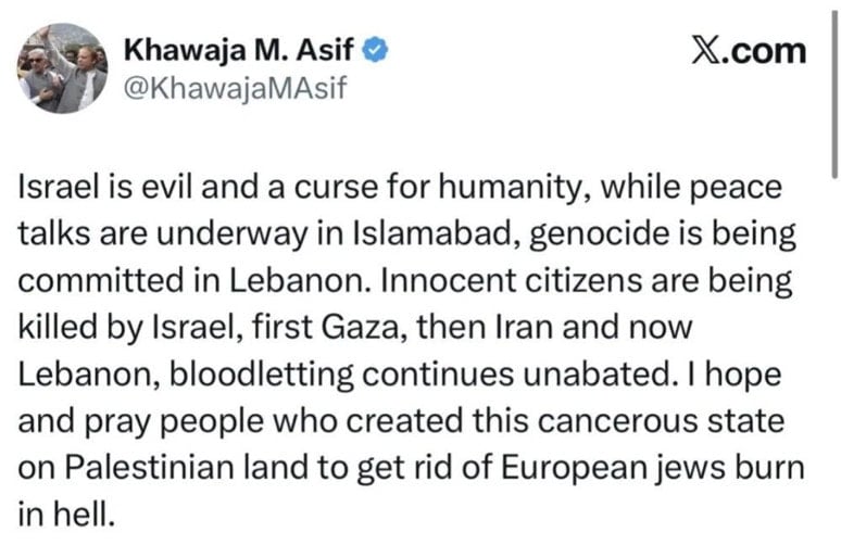 Savunma Bakanı Khawaja Muhammad Asif, perşembe günü sosyal medya hesabı üzerinden yaptığı paylaşımda, İsrail’i “şeytani” ve “insanlık için bir lanet” gibi sert sözlerle nitelendirerek, zehir zemberek ifadelerde bulundu.