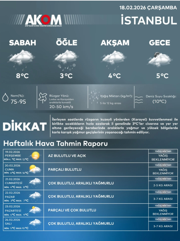 İstanbul ve Marmara Bölgesi genelinde yağışla birlikte kuzeyli yönlerden esen rüzgarın orta kuvvette, zaman zaman ise sert şekilde etkili olması bekleniyor. Yetkililer, ani sıcaklık düşüşü, kuvvetli rüzgar ve yağış nedeniyle oluşabilecek su baskınları ile trafikte yaşanabilecek aksamalara karşı vatandaşları dikkatli ve tedbirli olmaları konusunda uyardı.