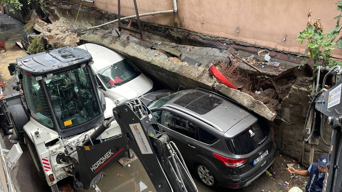Yılanlı Ayazma Sokak'ta bulunan Topkapı Otosanayi Sitesi'nin istinat duvarı, sağanak nedeniyle park halindeki araçların üzerine çöktü.