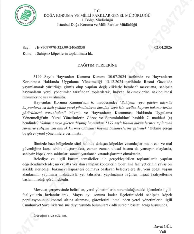 İstanbul Valisi Davut Gül, 5199 Sayılı Hayvanları Koruma Kanunu ve ilgili uygulama yönetmeliğinde yapılan son değişiklikleri gerekçe göstererek, İstanbul Büyükşehir Belediyesi ve 39 ilçe belediyesine resmi bir talimat yazısı gönderdi.