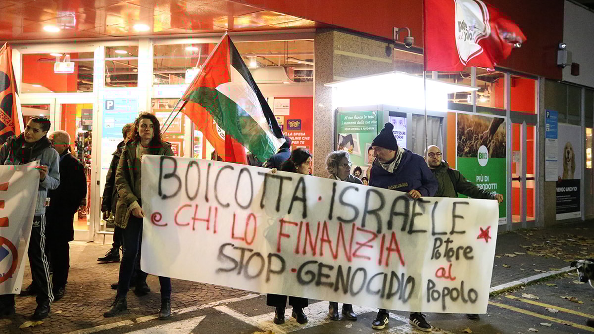Başkent Roma'da Filarete Caddesi'ndeki bir süpermarketin önünde toplanan Filistin'e destek veren sivil toplum kuruluşları ve sol tandanslı siyasi partilerden bir grup gösterici, "İsrail'e boykot" ve "Soykırımı durdurun" yazılı pankart açarak boykot kampanyasını duyurdu.