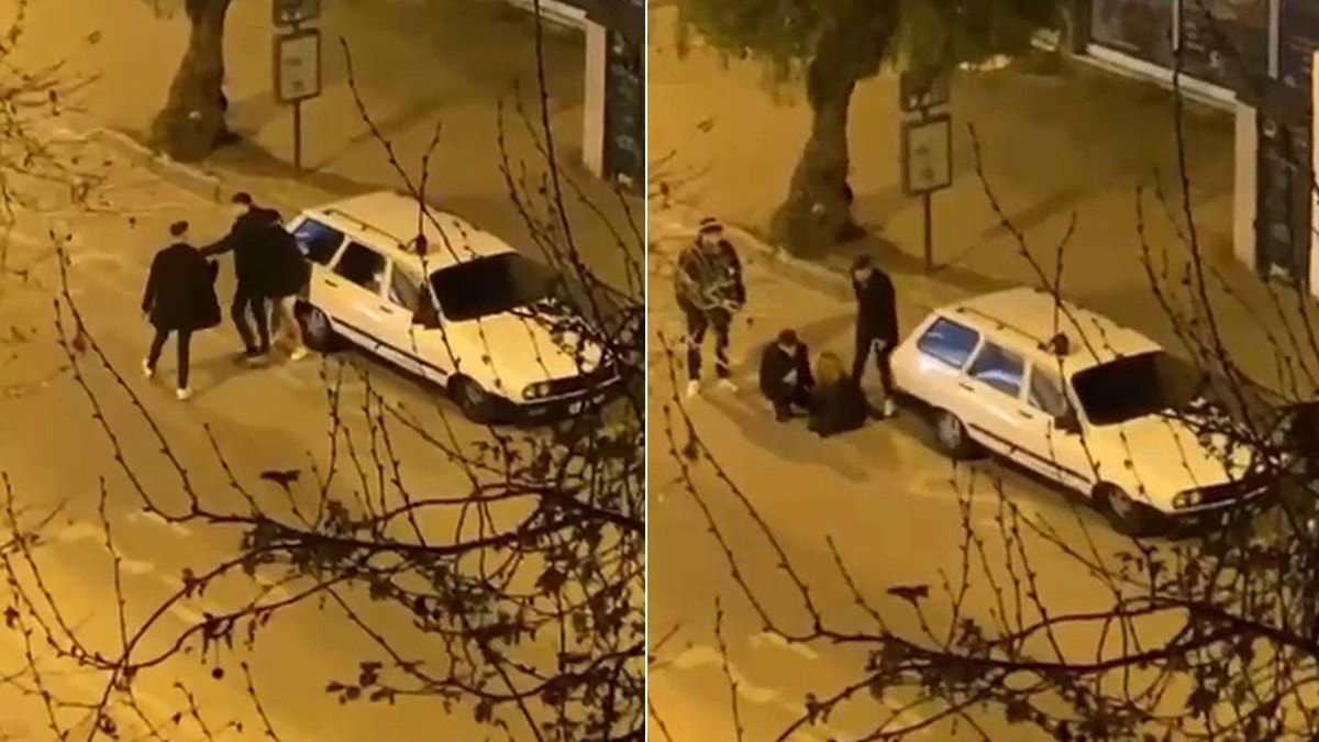 Olay, gece saatlerinde Bornova ilçesi Kazımdirik Mahallesi Gediz Caddesi'nde meydana geldi. Yol kenarına park eden otomobilin yanında bulunan biri kadın, 2'si erkek 3 kişi bilinmeyen bir nedenle tartıştı. Bağırışmaların ardından, erkeklerden biri kadına yumruk ve tekmeler atarak darbetmeye başladı. Bu sırada sinir krizi geçiren kadın, otomobile defalarca yumruk attı. Diğer erkek, kavga eden kişileri ayırmaya çalışırken, kadın yere düştü.