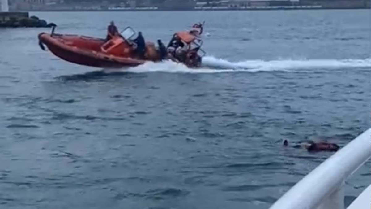 O anlar bir vatandaş tarafından cep telefonu ile görüntülendi. Görüntülerde, denize düşen yolcunun olay yerine gelen Kıyı emniyeti ekipleri tarafından kurtarılma anları yer alıyor. (DHA)