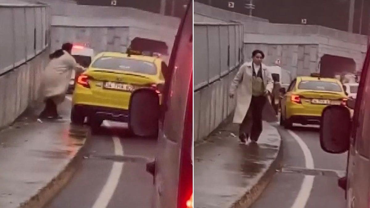 Fatih Sultan Mehmet Köprüsü bağlantı yolunda, trafik yoğunluğu nedeniyle 34 THA 82 plakalı taksi şoförü, aracın bir lastiğini kaldırıma çıkararak ilerlemek istedi. O sırada kaldırımdan yürüyen bir kadın, taksiye vurarak tepki gösterdi.