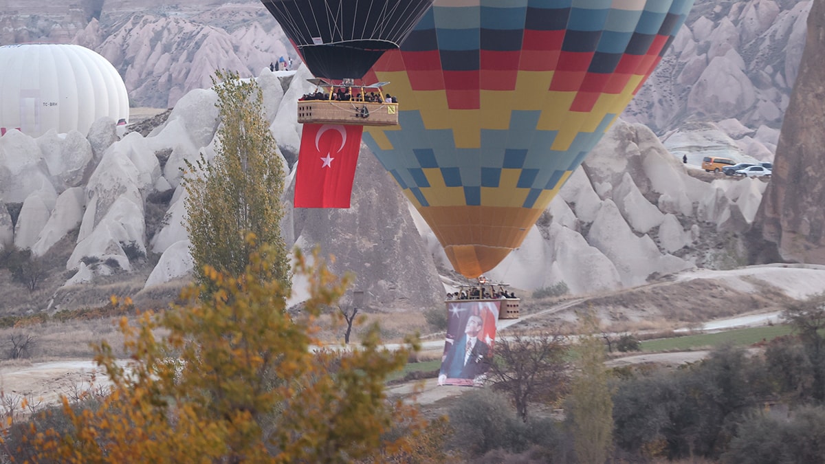 Nevşehir'in Göreme beldesinde, turistlere yönelik tur için hazırlanan bazı sıcak hava balonlarının sepetlerine, Türkiye Cumhuriyeti'nin kurucusu Mustafa Kemal Atatürk'ün ebediyete intikalinin 85. yılı dolayısıyla Türk bayrağı ve Atatürk posterleri asıldı.